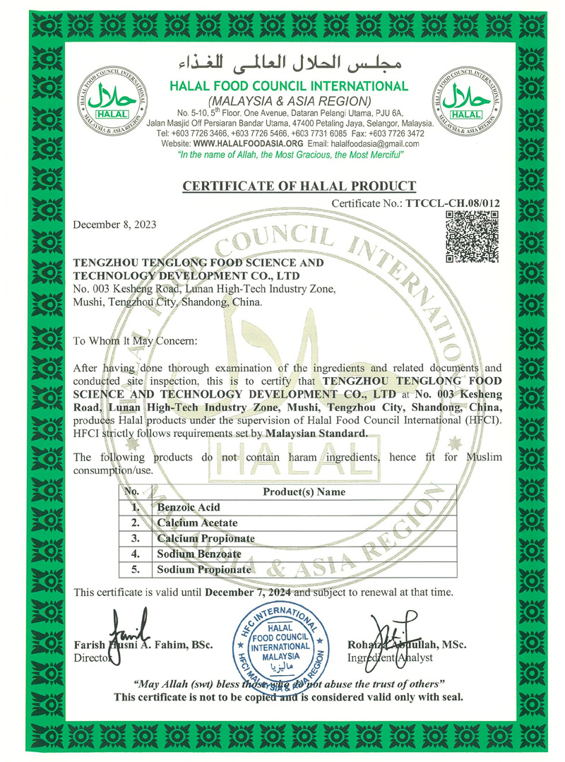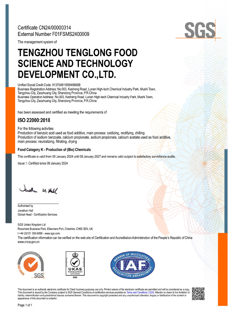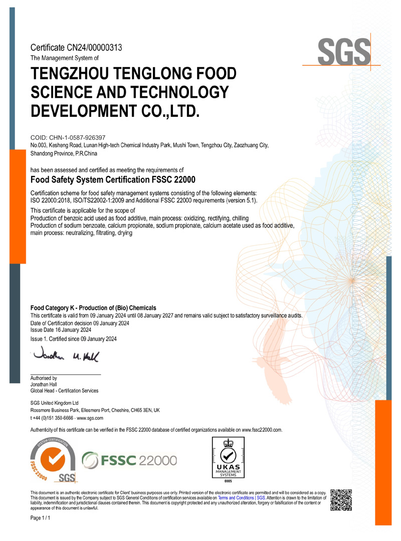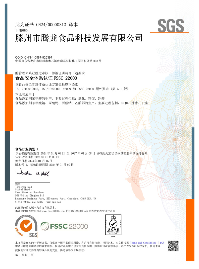 滕州市腾龙食品科技发展有限公司坐落在山东省滕州市木石镇鲁南高科技化工园区,成立于1996年,前身是滕州市腾龙化工有限责任公司,公司专业生产 苯甲酸,苯甲酸钠,丙酸钙,丙酸钠和醋酸钙等系列产品。